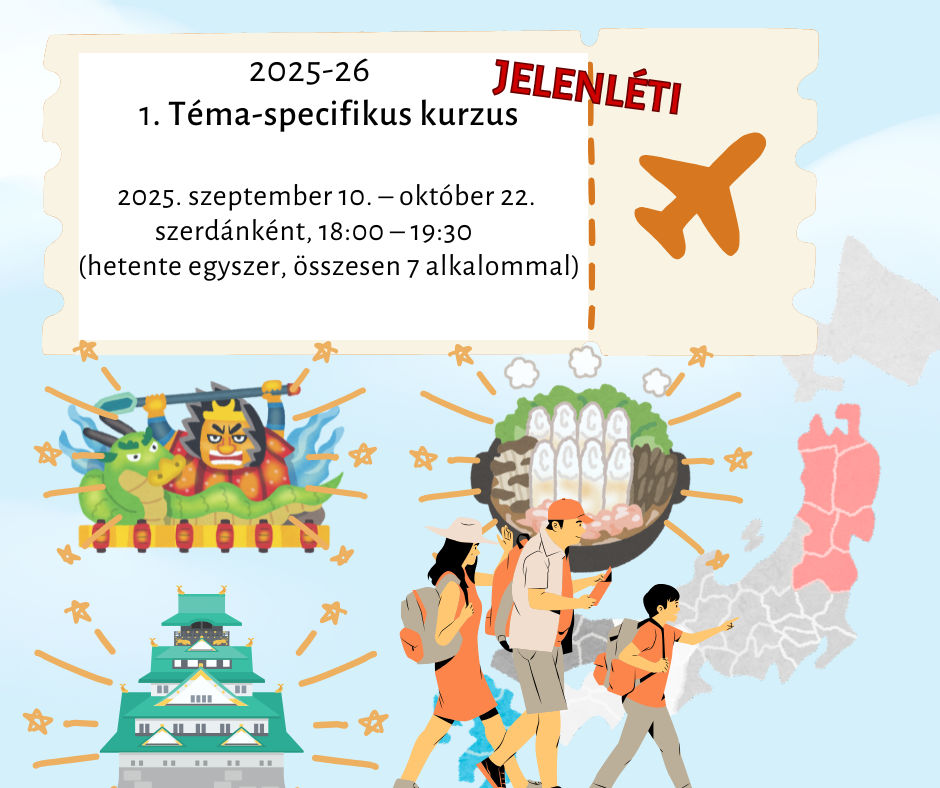 Ezen a kurzuson Japán Tōhoku régióját vesszük górcső alá. Miközben megismerkedünk a régió sokszínű vonzerejével, például a turisztikai látványosságokkal, a kultúrával és a gasztronómiával, fejlesztjük azon készségedet is, hogy japánul keress rá a téged érdeklő információkra, és rendszerezd a lényeges pontokat. A tanfolyam végén kutatási eredményeidet poszteren mutathatod be, amit a könyvtárában fogunk kiállítani. Készítsünk közösen egy remek posztert a Tōhoku régióról!