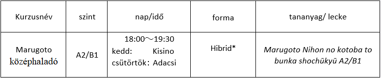 *A Marugoto Nihon no kotoba to bunka - shochukyu A2/B1 tankönyvet a Japán Alapítvány szerzi be és bocsájtja a hallgatók rendelkezésére. A tankönyv árát (5 000Ft) kurzuskezdésig kell befizetni. A könyveket az első eligazító órán osztjuk ki. Amennyiben online kíván részt venni tanfolyamunkon, gondoskodjon róla, hogy a könyvért az első fogalkozás előtt be tudjon fáradni irodánkba.