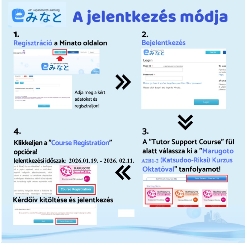 * A link kattintás után a Minato nyelvoktatási platformra navigál. A jelentkezéshez előzetes regisztráció szükséges. A regisztráció ingyenes.