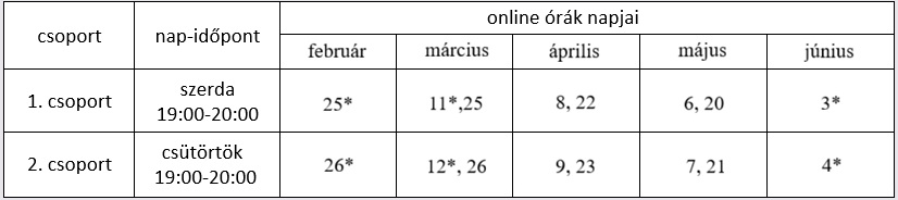 Az online nyelvi órák internetes videokapcsolat segítségével zajlanak, két hetente egy alkalommal. Az órák kb. 60 percesek. A tanfolyam 5 témakört dolgoz fel, a hallgatók témakörönként 1-1 órán vesznek részt. Regisztrációkor kérjük, arra a tanfolyamra jelentkezzen, melynek mind a 8 online foglalkozásán részt tud venni. Az online órák időpontját semmilyen körülmények közt nem áll módunkban megváltoztatni.