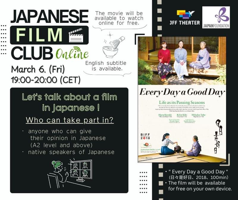 Az online filmklubon a résztvevők a programot megelőzően megtekintenek egy japán filmet, majd a filmklub napján szabadon, japánul véleményt cserélnek róla. A programra bárki jelentkezhet, aki érdeklődik a japán filmek iránt és szeretne japánul kommunikálni - akár most tanul japánul, akár korábban tanult japánul, akár japán anyanyelvű.