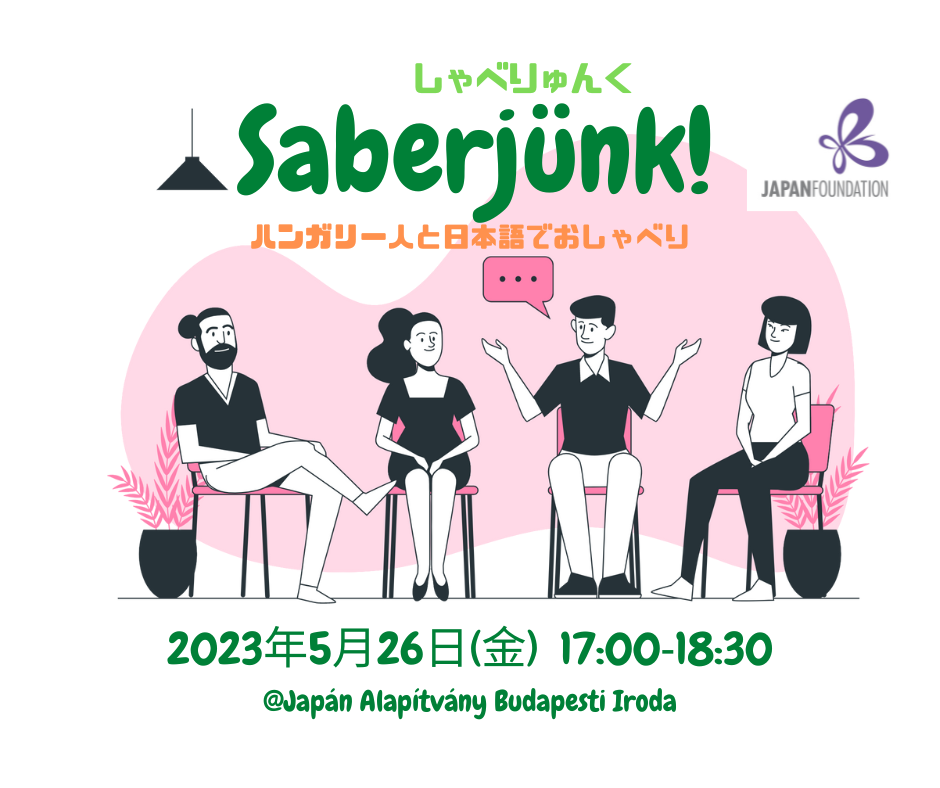 A Saberjünk! egy nyelvi találkozó, melyen a Magyarországon japánt tanulók kötetlenül beszélgethetnek japánokkal vagy egymással. Bárkit szívesen látunk, aki kicsit is ért japánul. A 2022-23. tanév utolsó JELENLÉTI foglalkozát a Japán Alapítvány Budapesti Irodában tartjuk. Jelentkezésre, regisztrációra nincs szükség. Ha van kedved japánul társalogni, látogass el a feltüntetett időpontban könyvtárunkba!