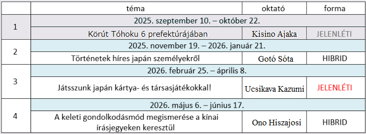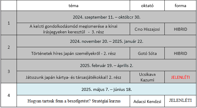 A Téma-specifikus kurzusok A2B1-B2 szintű nyelvtudással rendelkező nyelvtanulókat céloznak meg. Az összesen 7 órás tanfolyamokat a 2024-25. tanév során négy alkalommal hirdetjük meg. A témák minden alkalommal változnak, a kurzusok célja a japán nyelv és kultúra ismeretének elmélyítése. Egy vagy akár több kurzusra is lehet jelentkezni.
