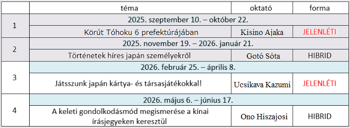 2. alkalom: Történetek híres japán személyekről - 3. részEzen a kurzuson a hallgatók megismerkednek a híres történelmi, valamint ma is élő, fontos japán személyiségekkel. A kurzuson szövegek olvasása mellett tematikus beszélgetéseket és prezentációkat is tartunk. A cél a B1 szintnek megfelelő szókincs és kifejezések gyarapítása, a megfelelő nyelvtani gyakorlás, a nyelvtudás fejlesztése.Felhasznált anyagok: "The Great Japanese 30 monogatari - kezdő-középhaladó", "The Great Japanese 30 monogatari - haladó".A 3. tanfolyamon új személyekről fogunk tanulni. A kurzuson részt vehetnek új és korábbi jelentkezők is.