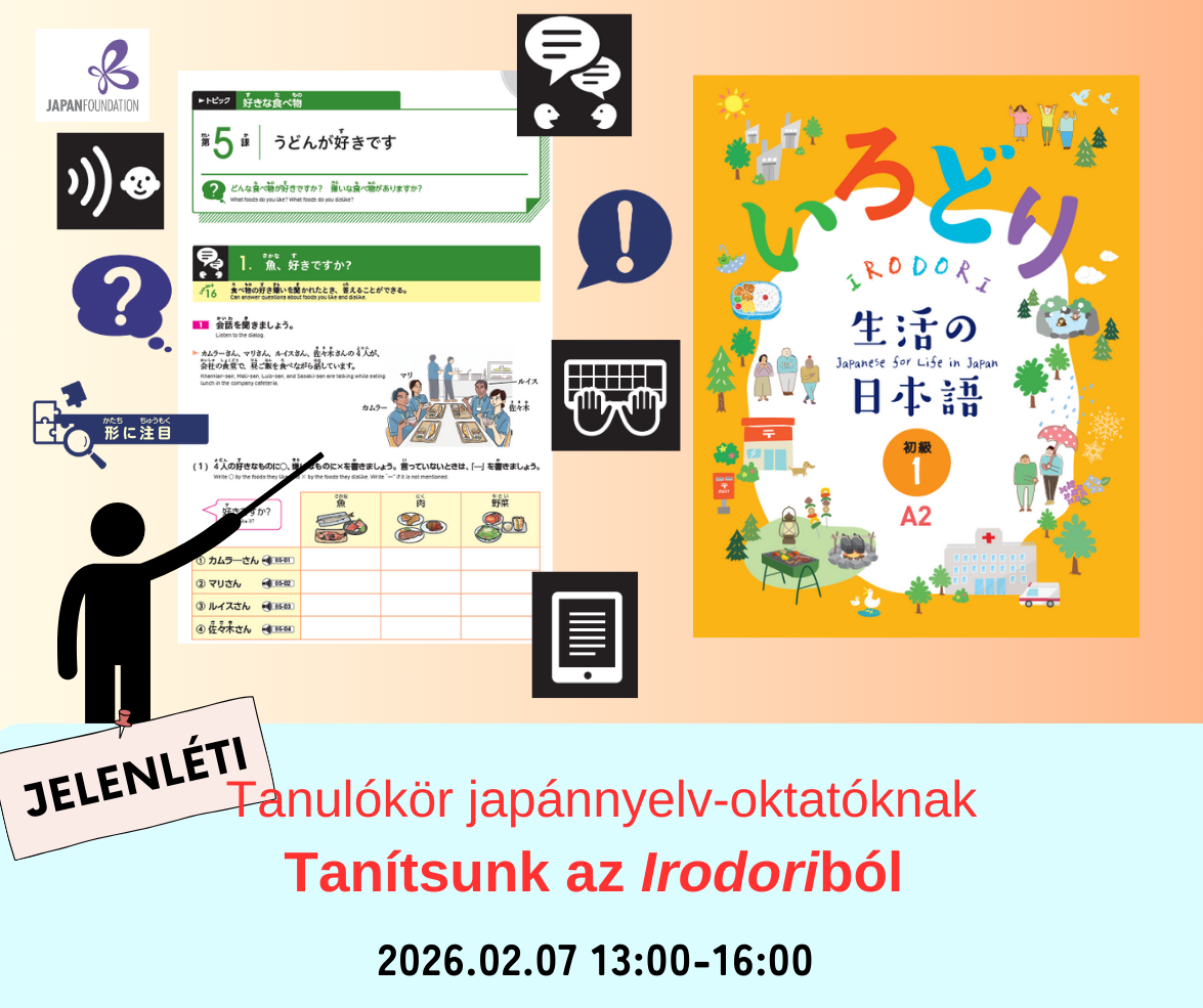 Szeretnéd kipróbálni a feladatközpontú Irodori tankönyvet? Ezen a workshopon az Irodori jellemzőinek rövid ismertetése után kis csoportokban, egymást segítve vághatsz bele az Irodori használatával zajló tanításba. Talán úgy érzed, ez neked nem fog menni, hisz még sosem tanítottál japánt, vagy kellemetlenül érzed magad, ha mások előtt kell bemutató órát tartani, de emiatt nem kell aggódnod. A bemutató órákhoz szükséges óravázlatokat és tananyagokat majd mi előkészítjük! Mivel mindenki ugyanazt az óravázlatot használja, nincs ok a lámpalázra, és a foglalkozás az óravázlatot követve zökkenőmentesen teljesíthető. A workshop célja, hogy az Irodori tankönyvön keresztül mindenki megtapasztalhassa a feladatközpontú nyelvoktatást. Azok számára, akik még sosem tanítottak japánt, ez egy kiváló kezdő lépés lehet. Annak is ajánljuk ezt a képzést, aki a nyelvtani központú órákon kívül más tanítási módszerekre is kíváncsi. Várunk mindenkit szeretettel!